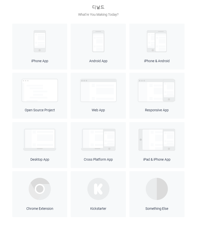 만약 이름을 정했으면 다음화면으로 이런 화면이 나와야 정상입니다! 여기서는 본인에게 필요한 유형을 선택하는건데요 어떤식으로 홍보를 할꺼냐 만약 모바일 앱 서비스에 관한 거라면 아이폰 앱, 안드로이드 앱, 둘다 필요하다면 아이폰&안드로이드가 같이 있는 유형을 선택하시면 되고 사이트에 필요한거라면 아래에 있는 유형들을 선택해주시면 됩니다 저는 아이폰&안드로이드 유형을 선택 해보겠습니다.