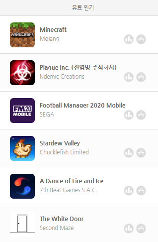 다음은 유료 인기 게임입니다 유료 게임은 정말 사람의 마음을 사로잡아야 고객이 결제를 하고 게임을 구매하게 되는데요 그만큼 순위권에 들기도 어렵고 꾸준하게 마니아층이 있어야 한다는 점 입니다. 1순위에는 마인크래프트가 있네요 마인크래프트는 정말 매니아층이 두껍고 인기가 사라질 기미가 안 보이는 게임 중에 하나죠 제가 포스팅하는 내용 중에 하나이기도 하고요. 2위에는 Plague Ine. 게임이 있습니다 이 게임은 전염병을 컨셉으로 잡은 게임입니다 광고도 적지 않게 하고 있고요 알 사람들은 다 아실 거 같습니다.