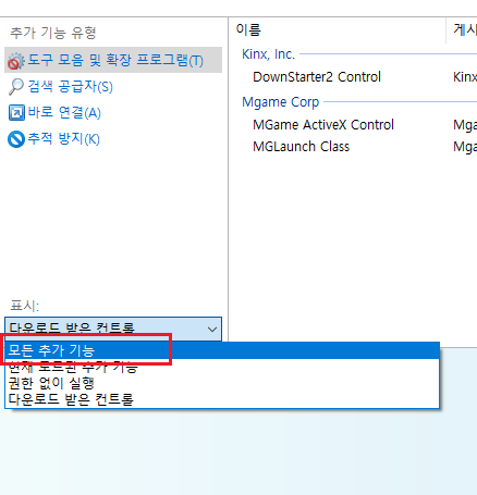 모든 추가 기능 으로 설정해주시면 보이게 됩니다.