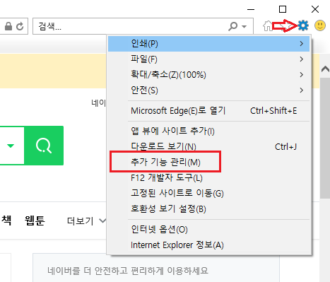 윈도우10의 인터넷 익스플로러의 경우 따로 Flash Player를 설치하지 않아도 이미 설치가 되어있기 때문에 추가적으로 설치할 필요가 없습니다. 이점 유의해주시길 바라고 첫 번째 해결 방법에 대해서 설명해드리겠습니다. 우선 브라우저를 켜준 후 우측 상단 톱니바퀴 > 추가 기능 관리를 선택해줍니다.