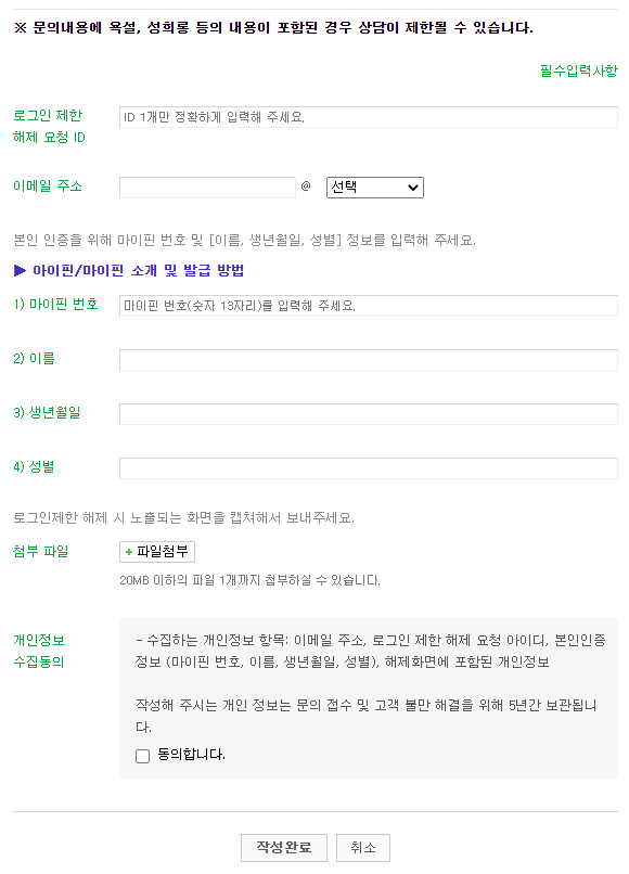 조금 내리다보면 문의할 수 있는 화면이 나오게 됩니다. 여기서 로그인 제한 해제 요청 ID, 이메일 주소, 아이핀/마이핀 번호, 이름, 생년월일, 성별, 첨부 파일 등 작성해주신 후 개인정보 수집 동의 체크와 작성 완료를 클릭해주시면 성공적으로 문의 접수가 됩니다. 마찬가지로 고객센터로부터 답변은 오후 6시 전에 접수했다면 당일날에 받을 수 있으며 그 이후에 접수했을 경우 다음날에 받습니다.