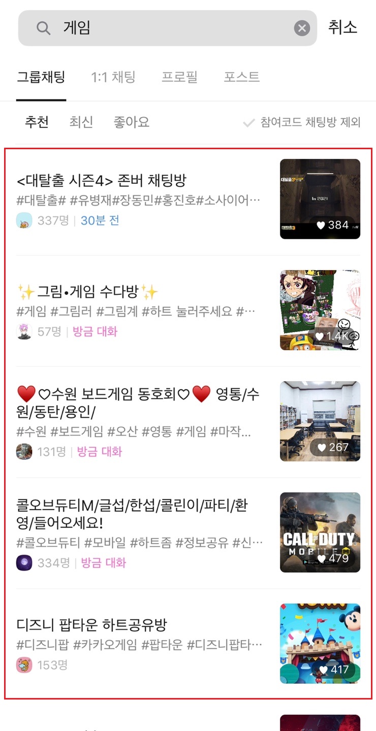 검색창에 예시로 게임이라 검색해봤습니다. 아래 오픈채팅방들은 추천순으로 배치되어있으며, 최신 및 좋아요 순으로도 확인할 수 있습니다. 기본으로 그룹채팅으로 설정되어있지만 1:1 채팅방을 원하신다면 상단 그룹채팅 옆에 있는 1:1 채팅을 터치해서 변경해주시면 됩니다.