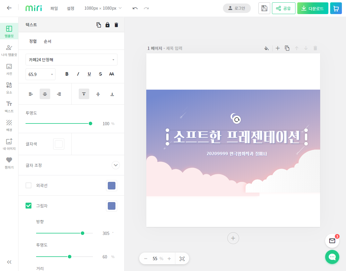 또한 글씨만 수정이 가능한 것이 아니라 텍스트의 세부적인 수정, 사진, 요소, 텍스트, 배경 등 여러 가지 수정이 가능합니다.