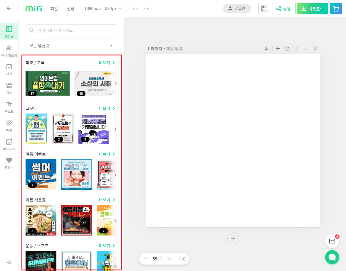 왼쪽에는 기본적으로 보이는 화면입니다. 카테고리별로 템플릿이 정리되어있는 모습을 확인할 수 있습니다. 더보기 버튼을 클릭하시면 더 많은 템플릿들이 보이게 됩니다.