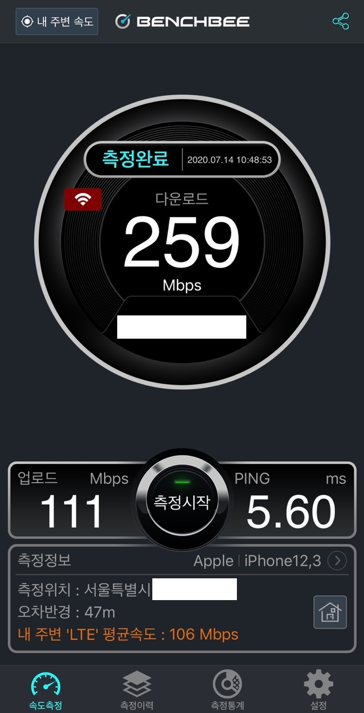 이 어플도 마찬가지로 중앙에 위치한 테스트 시작 버튼을 눌러주시면 속도 측정이 가능하고. WIFI 측정할 땐 LTE를 꺼주시고 LTE 측정할 땐 WIFI를 꺼주시면 됩니다.