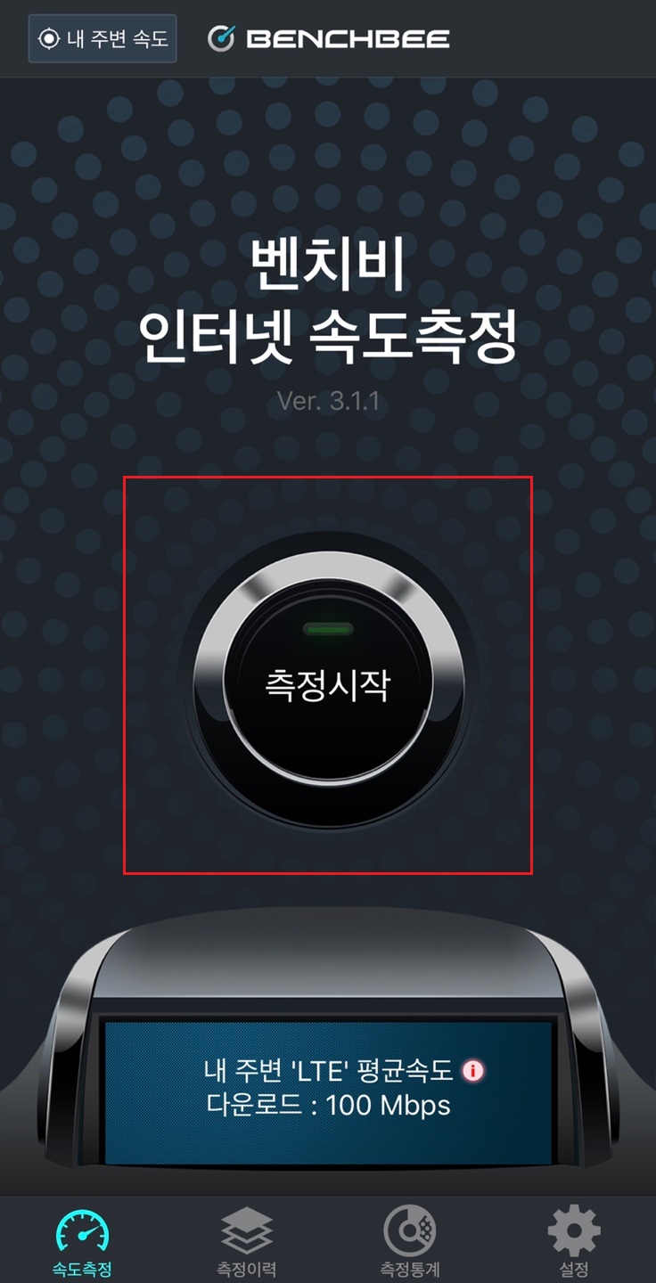 어플 설치가 완료되고 어플을 실행시키시면 측정시작 버튼이 보이게 됩니다. 이 버튼을 눌러서 측정해주시면 되는데요. 이때 WIFI를 측정하고 싶으시다면 LTE를 꺼주시고 WIFI만 켜주시면 됩니다. 반대로 LTE를 측정하고 싶으시다면 WIFI를 꺼주시고 측정 시작 버튼을 눌러주시면 됩니다.