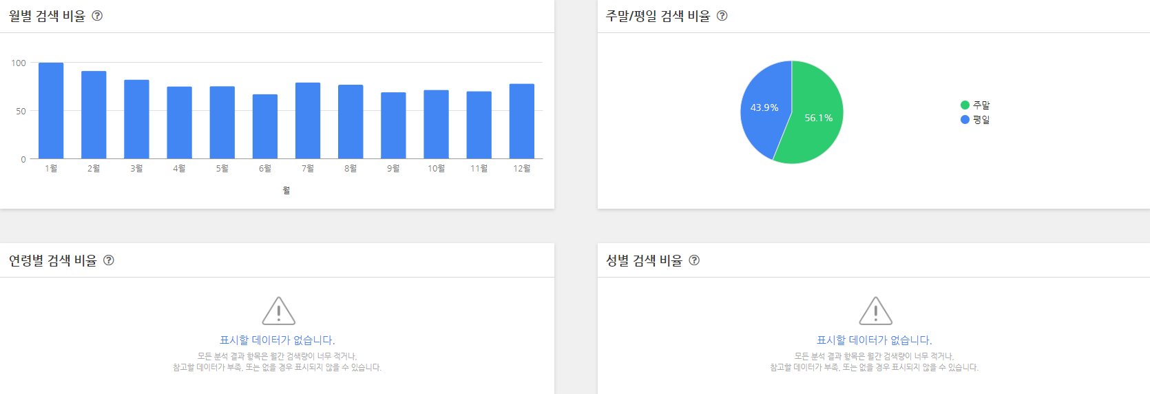 월별 검색, 주말/평일 검색, 연령별 검색, 성별 검색 비율 등 다양하게 분석할 수 있게 표시가 되어 있습니다. 확실히 게임에 관련된 키워드들은 평일보단 주말에 검색량이 더 많은 거 같습니다. 아쉽게도 연령별이랑 성별은 안 나와있는데요. 브랜딩 블로그나, 쇼핑몰을 하시는 분들에 겐 연령 및 성별 검색이 아주 유용하게 잘 쓰일 거 같습니다.