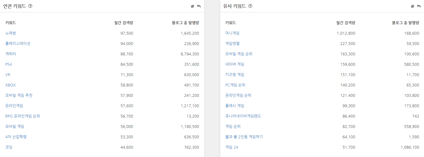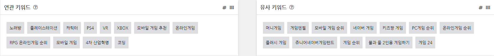 연관 및 유사 키워드에 대한 정보가 자세하게 나와있습니다. 여기서 알아야 할 점은 엄청난 파급력이 있는 블로그가 아닌 이상 게임이라는 키워드만 넣을 시 노출이 안된다는 점을 알아야 합니다. 그렇기 때문에 유사 키워드를 참고하거나 서브적으로 키워드를 하나 더 넣어서 노출을 시켜야 합니다.