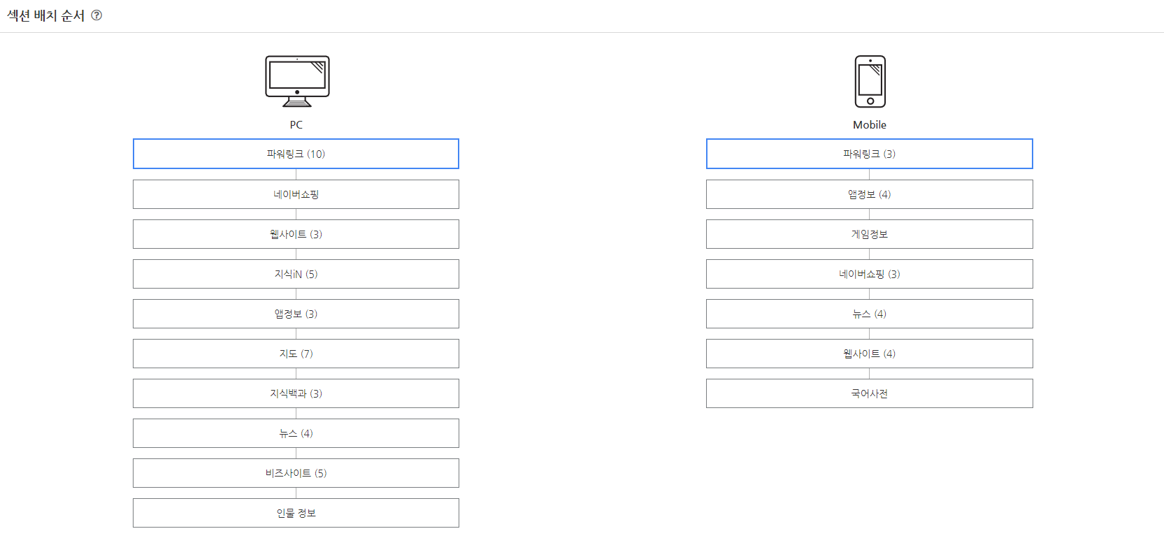 마지막으로 섹션 배치 순서를 확인할 수 있는데요 이게 뭐냐면, PC로 검색했을 시 맨 처음에 뜨는 화면이 파워링크부터 나온다는 이야기 입니다. 제가 검색을 했던 게임이라는 키워드는 PC에서 검색했을시 아주 비효율적이라고 보면 되겠네요. 저는 블로그로 포스팅을 하기때문인데 PC에서 검색했을시 블로그 탭이 보이지가 않기 때문이죠, 모바일 또한 마찬가지로 VIEW 탭이 없는 관계로 블로그로 게임 이라는 키워드를 작성했을 시 아주 비효율적이라고 보면 되겠습니다. 그렇기 때문에 PC에선 블로그 탭이 3위 안에 있는 것이 가장 좋고, 모바일 탭에선 VIEW 탭이 1,2 위에 있는것이 가장 좋다고 볼 수 있습니다.