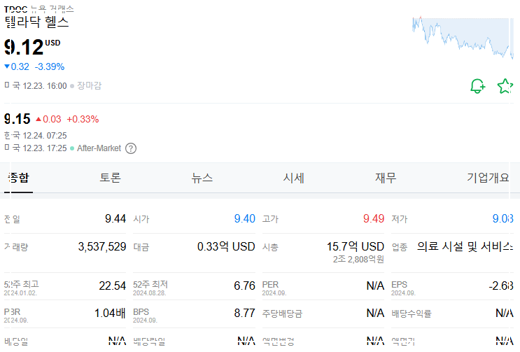 - Teladoc Health는 원격의료와 디지털 헬스 케어 서비스를 제공하며, 글로벌 원격진료시장에서 선두를 달리고 있습니다. AI 기반 진단 도구와 가상진료를 통해 의료 접근성을 크게 향상하며, 특히 만성질환 관리와 정신건강 서비스에서 장점을 가지고 있습니다. 팬데믹 이후 디지털 헬스케어에 대한 수요가 증가했으며, Teladoc Health는 이러한 트렌드의 수혜를 받고 있습니다.