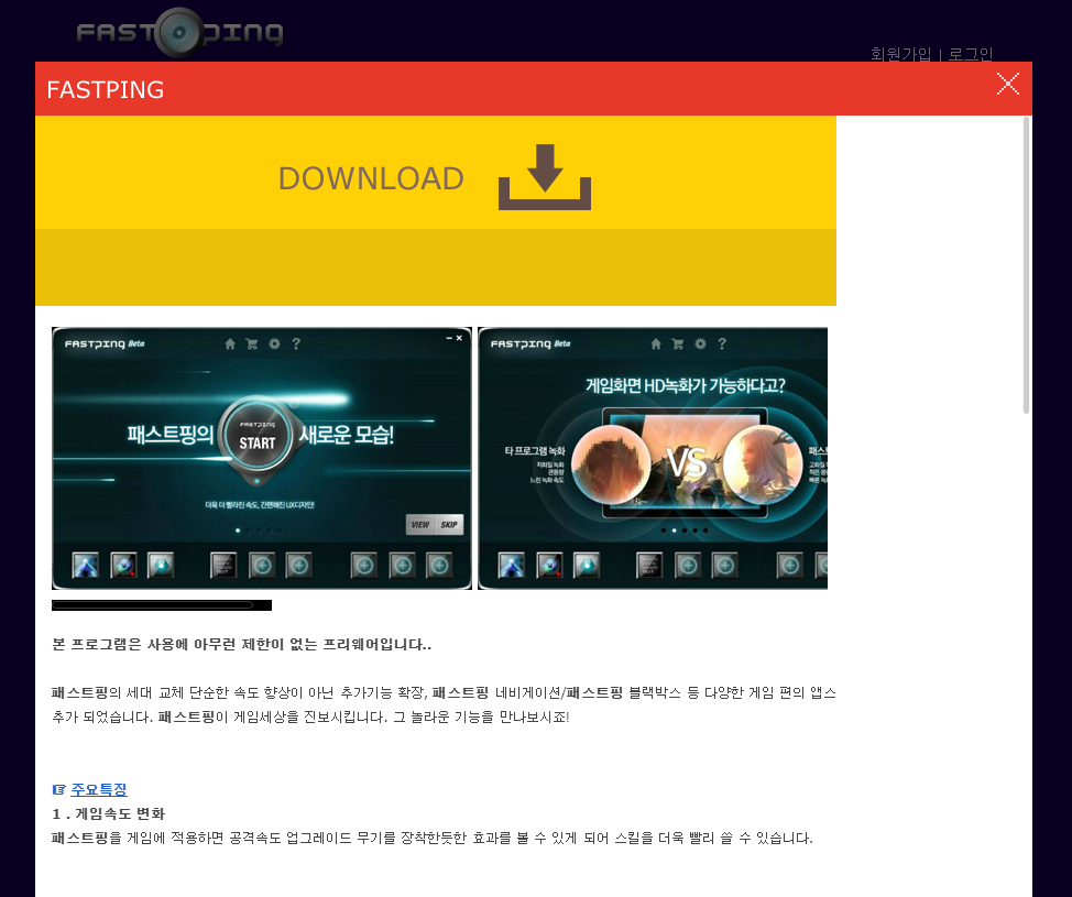 게임 최적화 프로그램을 다운로드 받기위해 공식 홈페이지에 들어가야 됩니다. 패스트핑 다운로드를 하기 위해선 위에 화면으로 들어가야 됩니다. 저기서 무료 다운로드 버튼을 눌러줍시다~