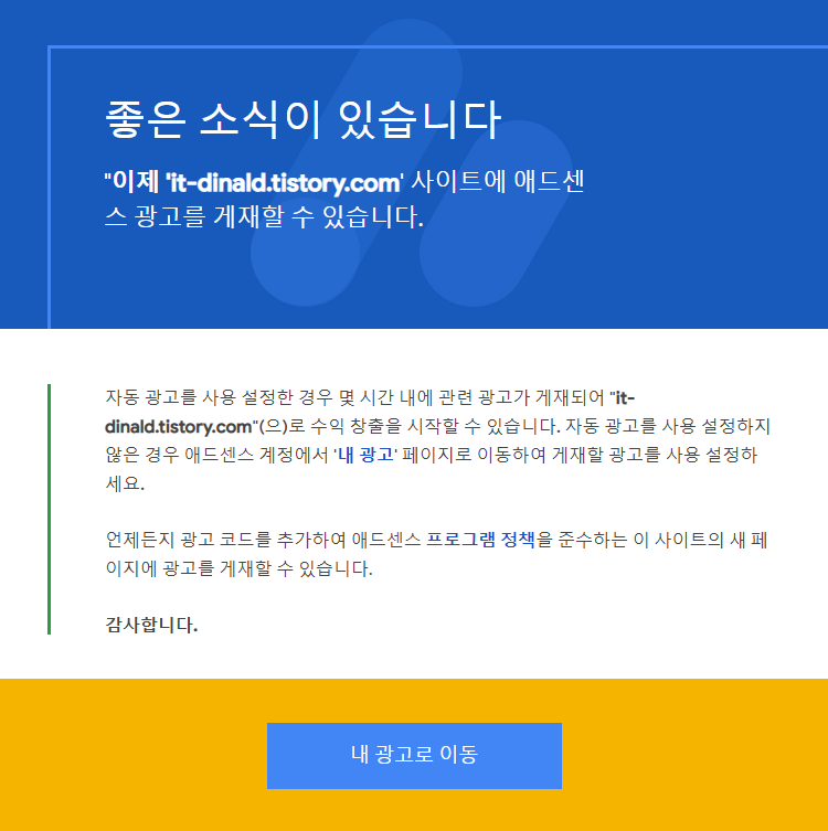 3월 2일부터 티스토리 블로그를 제대로 시작하며, 1일 1포 스팅을 3월 17일 까지 하며 총 포스팅 갯수 22개를 채웠습니다. 그러고 나서 애드센스 신청을 해놓고, 다른 사람들의 글을 보면서 애드센스가 얼마나 걸리는지와 조건에 대해서 찾아봤습니다. 조건에 대해 찾아보니 저는 애드센스 승인을 받는데 자신감이 떨어지기 시작했습니다. 조건에 미치지 못하는 게시글도 있었고 방문자수도 적고, 포스팅 갯수도 적기 때문 이였죠 그래서 거의 포기한 상태로 1일1포스팅을 계속 유지해 왔는데요. 애드센스 신청을 하고 4일 뒤인 3월 21일에 메일을 하나 오게 됩니다. 그 메일은 바로 아래와 같은 메일입니다.