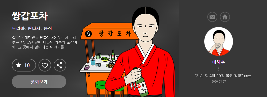 2위 쌍갑포차 입니다. 매주 수요일마다 연재되고 있는 웹툰입니다. 장르는 드라마, 판타지, 음식으로 분류되어있습니다. 쌍갑포차는 줄거리를 제가 직접 설명해드리는 것보다 직접 보시는 것이 가장 좋습니다. 시간을 낭비했다고 생각이 절대 안들 정도로 가치가 있다고 생각하는 웹툰 중 하나 이기 때문에 직접 보시고 판단하시는 것을 추천드립니다.