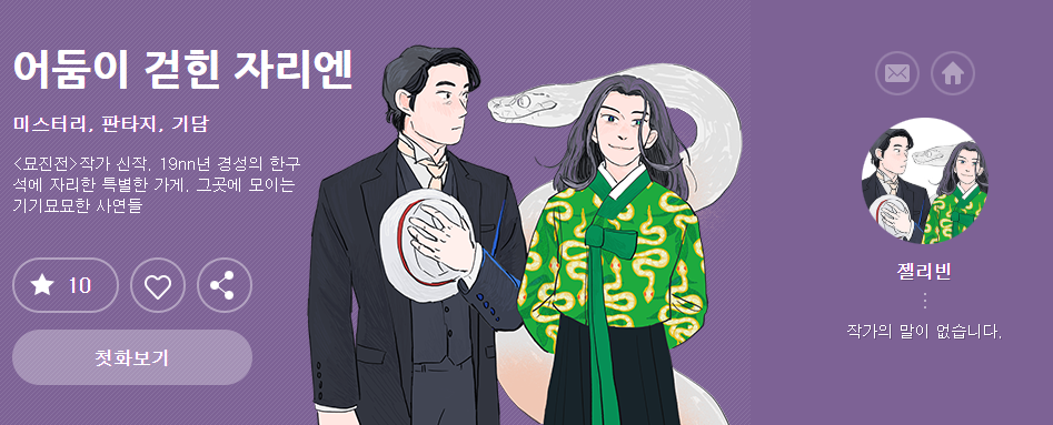 3위 어둠이 걷힌 자리엔 입니다. 지금은 완결이 되었습니다. 장르는 미스터리, 판타지, 기담으로 분류되어있습니다. 간단하게 줄거리를 요약하자면, 주인공은 살아있는 사람들뿐만 아니라 영적 존재까지 볼 수 있는 능력을 가지고 있습니다. 주인공은 오월중개사무소에서 직원으로 일하고 있으며, 중고 물품을 매입하고, 다시 재판매를 하는 일을 하고 있죠. 하지만 주인공 최두겸이 일하고 있는 중개소에는 살아있는 사람들만 오는 것이 아니라 영적 존재들도 찾아오게 됩니다. 기담으로 분류되어있어서 무서울 수도 있지만 그렇게 많이 무섭지는 않습니다.