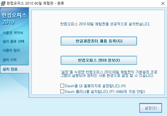 마지막으로 한글 2010 설치를 마치는 단계입니다. 여기서도 마찬가지로 아래에 두 개다 체크가 되어있을 텐데 원하지 않는 경우 체크 해제를 하시고 마치는 것이 좋습니다. 따로 설정할 게 있다면 오른쪽 하단에 설정 버튼을 클릭해서 설정을 해주시면 되고 설정이 필요 없다면 꺼주시면 됩니다. 그리고 바탕화면으로 가셔서 정상적으로 한컴오피스가 설치가 되어있는지 확인을 해야 됩니다. 한컴 사전, 한컴오피스 한글 2010, 한컴오피스 한셀 2010, 한컴오피스 한쇼 2010 총 4가지 프로그램이 설치되었다면 끝난 겁니다. 이제 한글 프로그램을 더블클릭해서 정상적으로 들어가지는지 확인해보겠습니다.