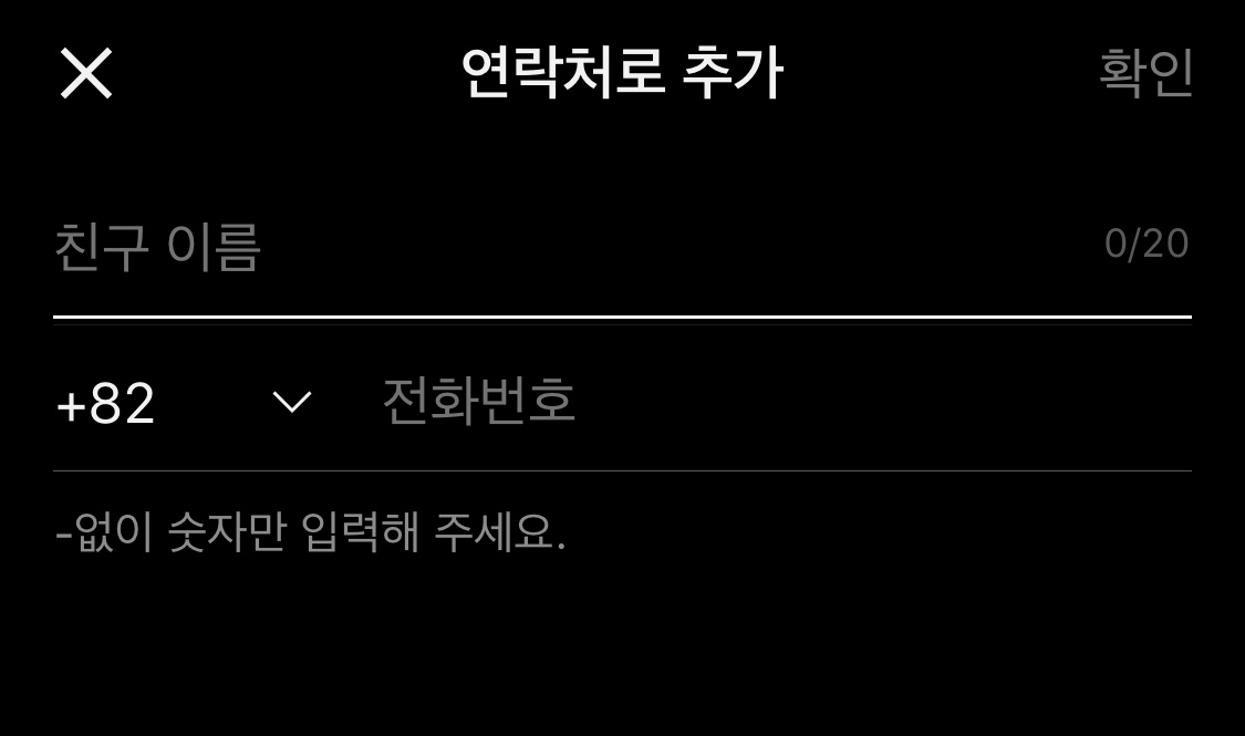 눌러서 들어가면 먼저 상대방의 이름을 정해야 하고 그다음 전화번호를 입력해주시면 되는데 이때 전화번호 사이에 -를 넣지 않고 입력해주셔야 합니다. 입력 후 확인 버튼을 누르면 친구 등록이 됩니다.