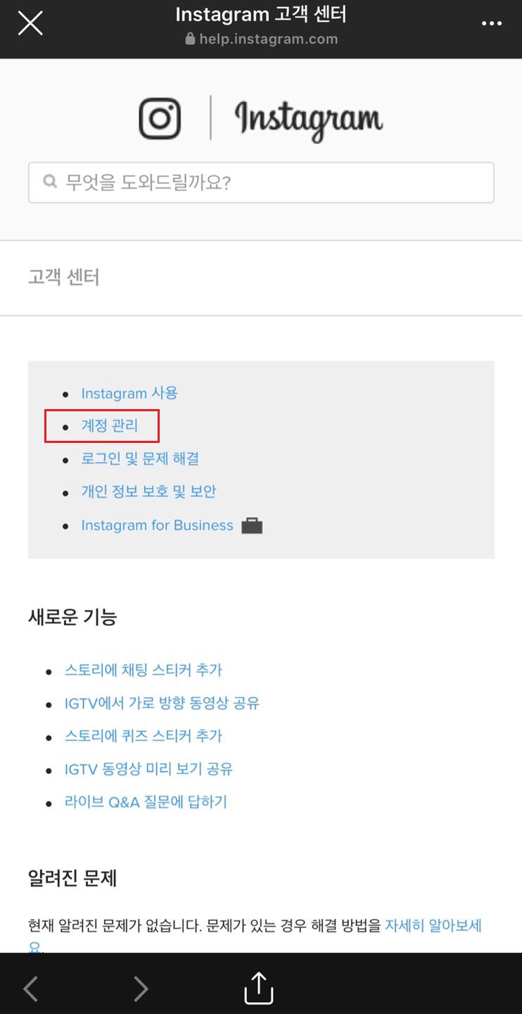 고객 센터에 들어가 주시면 첫 화면에 Instagram 사용 아래에 있는 계정 관리가 있습니다. 계정 관리를 눌러서 들어가 줍시다.
