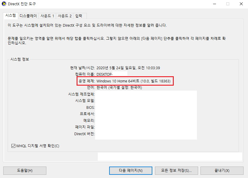 윈도우 키 + R을 동시에 누르게 되면 실행 창이 뜨게 됩니다. 입력창에다 "dxdiag"를 입력하신 후 확인 버튼을 눌러주시면 됩니다.