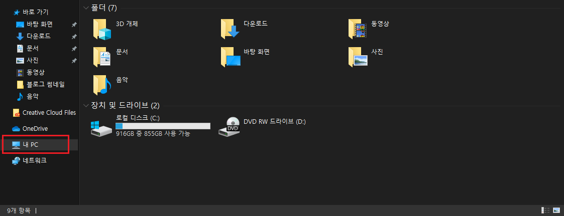 윈도우 키 + E 동시에 눌러주시면 위와 같은 창이 하나 뜨게 됩니다. 저기서 왼쪽 하단을 보게 되면 내 PC가 보이실 텐데요. 마우스로 우클릭을 하셔서 맨 하단에 있는 속성을 클릭해주시면 됩니다.