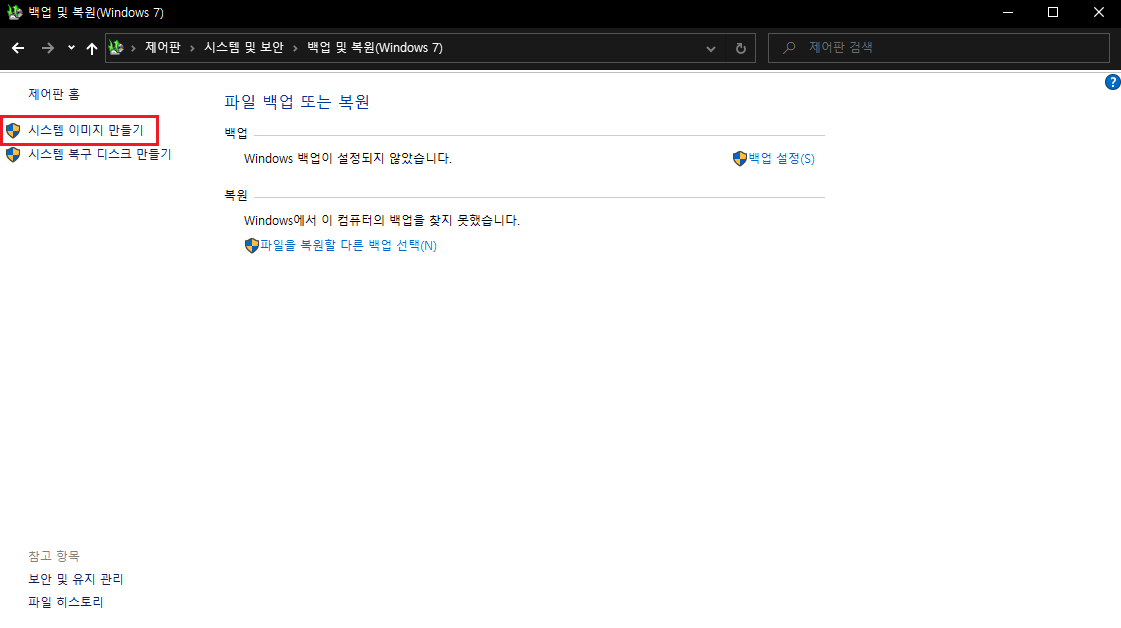 좌측 상단에 시스템 이미지 만들기를 클릭해주셔야 합니다. 절대로 파일 백업 또는 복원에 있는 백업 설정 클릭하시면 안 됩니다.