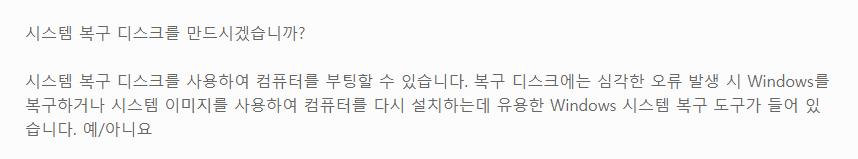 반드시 안내사항 확인하신 후 예 버튼을 눌러주시길 바랍니다. 만약에 윈도우가 부팅이 안 되는 경우 복구를 해야 하기 때문에 USB를 통해 부팅 디스크를 만들어주셔야 합니다. 그런 다음 바이오스 화면에서 부팅 우선순위를 부팅 USB로 설정한 후 이미지 복구를 진행하면 정상적으로 해결할 수 있게 됩니다.