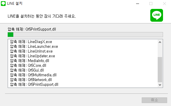 설치 완료까지 걸리는 시간은 대략 3분~5분(컴퓨터 환경마다 다름) 정도 기다리면 설치가 완료됩니다. 설치 완료 창이 뜨면 "마침" 버튼을 클릭해서 라인(LINE)을 켜줍시다.