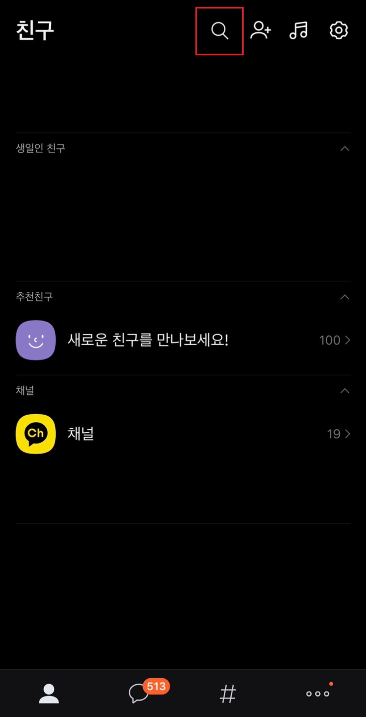 우선 카카오톡 메인화면에서 상단에 있는 "돋보기" 아이콘을 눌러줍시다.