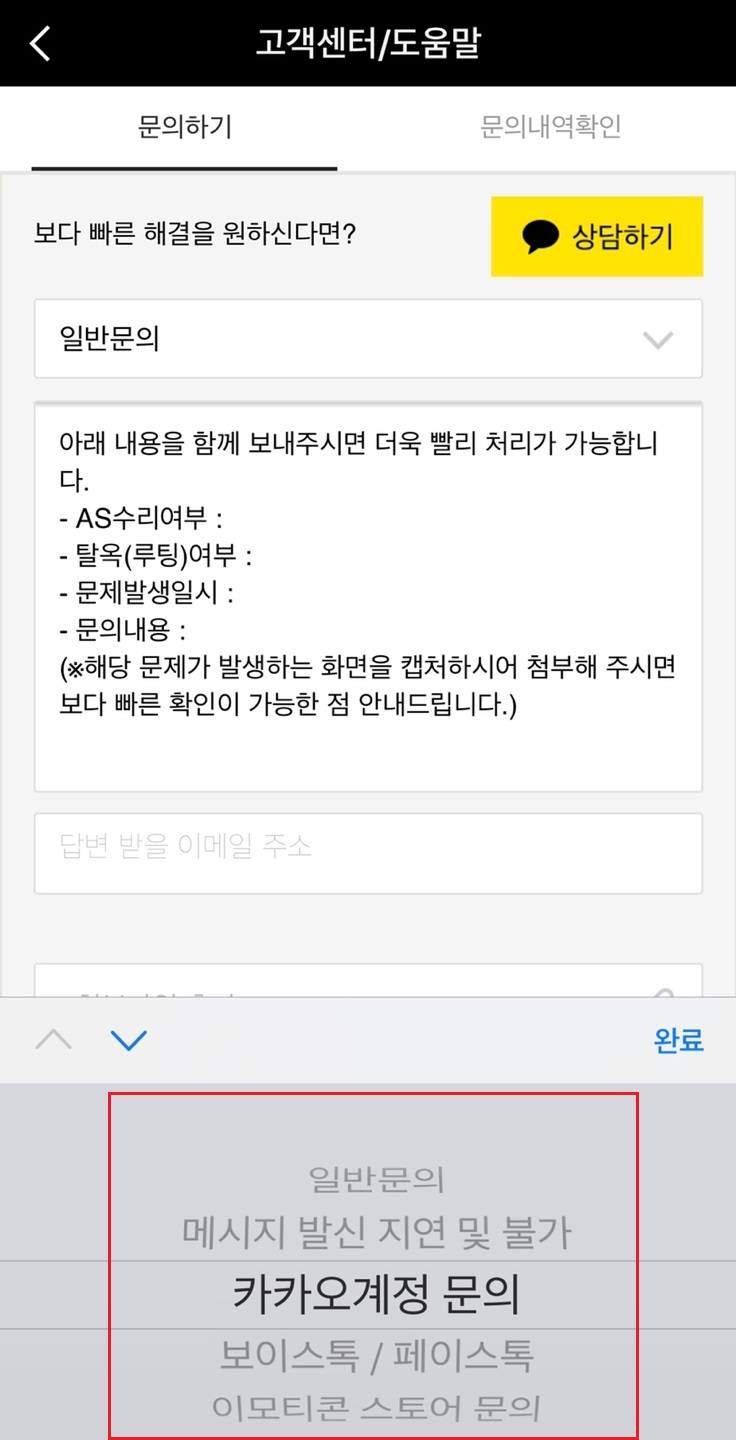 문의하기 창으로 들어오셨으면 빨간색 네모 박스로 체크되어 있는 부분을 눌러주시면 됩니다. 단 일반 문의일 경우 변경하지 않고 그대로 문의사항 안내에 맞춰서 문의해주시면 됩니다.