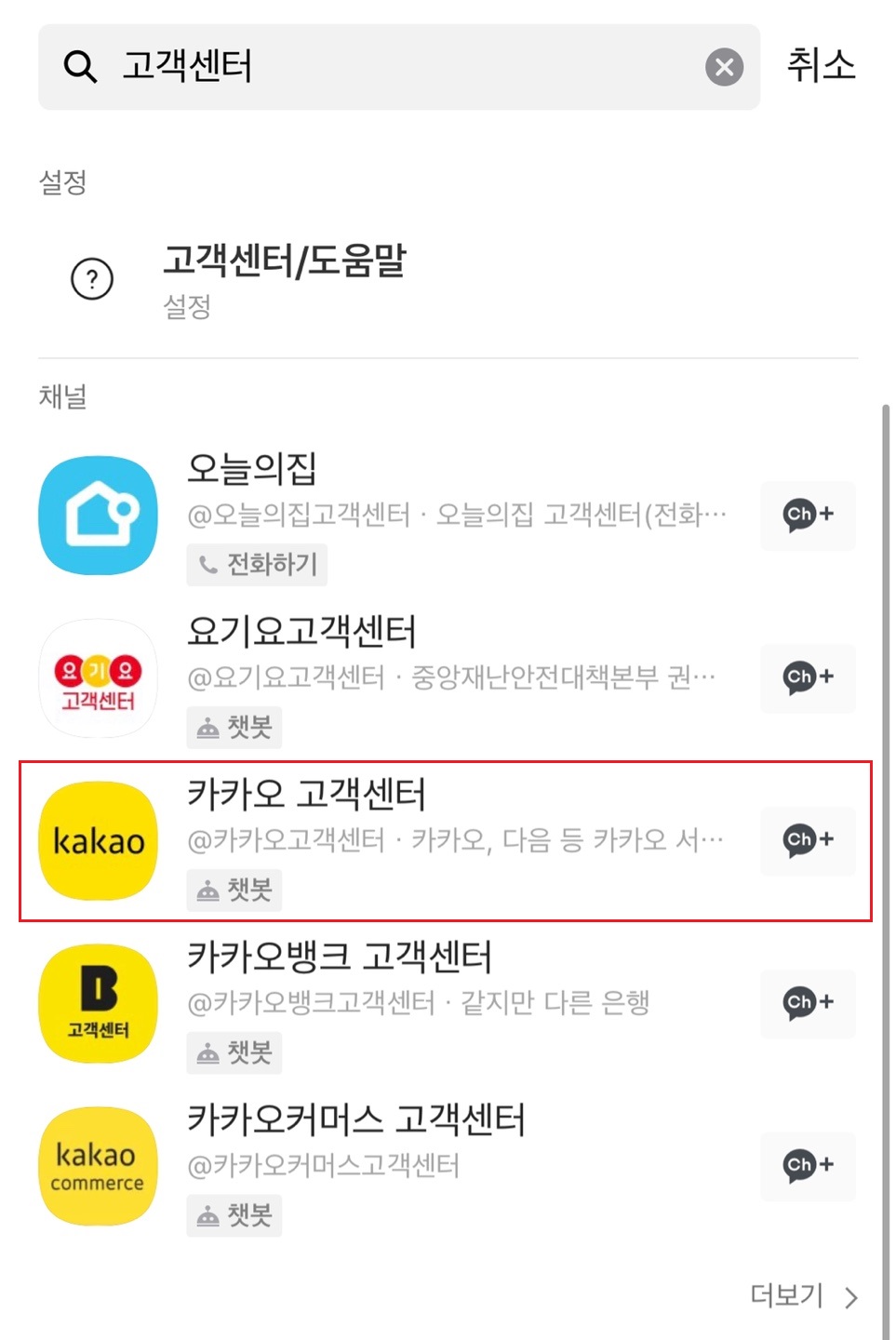 검색창에 "고객센터"를 입력하시면 아래에 고객센터에 대한 목록들이 뜨게 됩니다. 여기서 "카카오 고객센터"를 눌러주시면 됩니다.