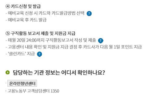 마지막으로 신청하는 방법에 대해서 살펴보겠습니다. (1. 신청 및 접수 > 2. 자격 요건 심사 및 대상 선정 > 3. 예비교육 > 4. 카드 신청 및 발급 > 5. 보고서 제출 및 지원금 지급) 순서대로 진행됩니다. 더 자세한 내용은 아래를 참고해서 신청하시길 바랍니다. 신청은 매월 25일까지 가능하며 PC와 모바일 둘 다 가능하다고 합니다. 신청서를 제출하면 신청자격이 되는지 검토 후 판단을 하기 때문에 신청서 제출 후 기다리시면 됩니다. 신청 도중 어려움을 겪는다면 아래에 있는 고용노동부 고객상담센터에 전화해서 물어보는 것이 가장 빠른 방법입니다.