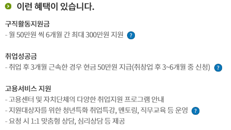 - 구직활동지원금 - 월 50만 원씩 6개월 간 최대 300만 원 지원