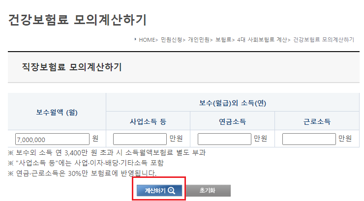 직장 의료보험료 모의계산 홈페이지 바로가기