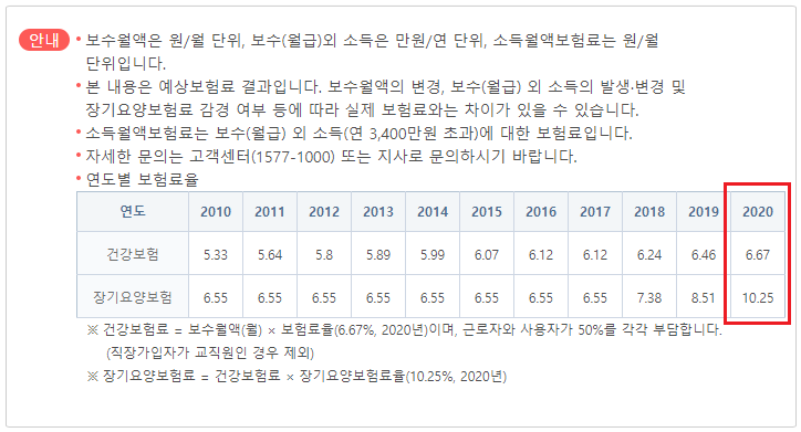 700만 원인 경우 건강 보험료 257,370원으로 계산이 됩니다. 2020년 기준으로 건강보험 6.67%이므로 700만 원에서 사업주와 근로자가 50%씩 부담해서 내는 금액이 총 257,370원입니다. 위 표를 보시면 아시겠지만 매년마다 오르는 것을 확인할 수 있습니다. 그렇기 때문에 매년마다 변동이 되는 것을 감안해 매년마다 계산을 해주셔야 더욱 정확하게 알 수 있습니다.
