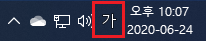 두 번째 방법으로 오른쪽 하단에 보시면 시간 및 날짜 왼쪽에 위치해 있는 입력 도구 기능을 활용하는 방법입니다. <가>로 되어있을 경우 한글로 타이핑이 가능하며 <A>로 되어있는 경우 영문으로 타이핑이 가능하게 되어있습니다. 키보드 로 변환이 안 되는 경우 저 곳을 클릭해서 변경이 가능하기 때문에 버그를 해결할 수 있습니다.